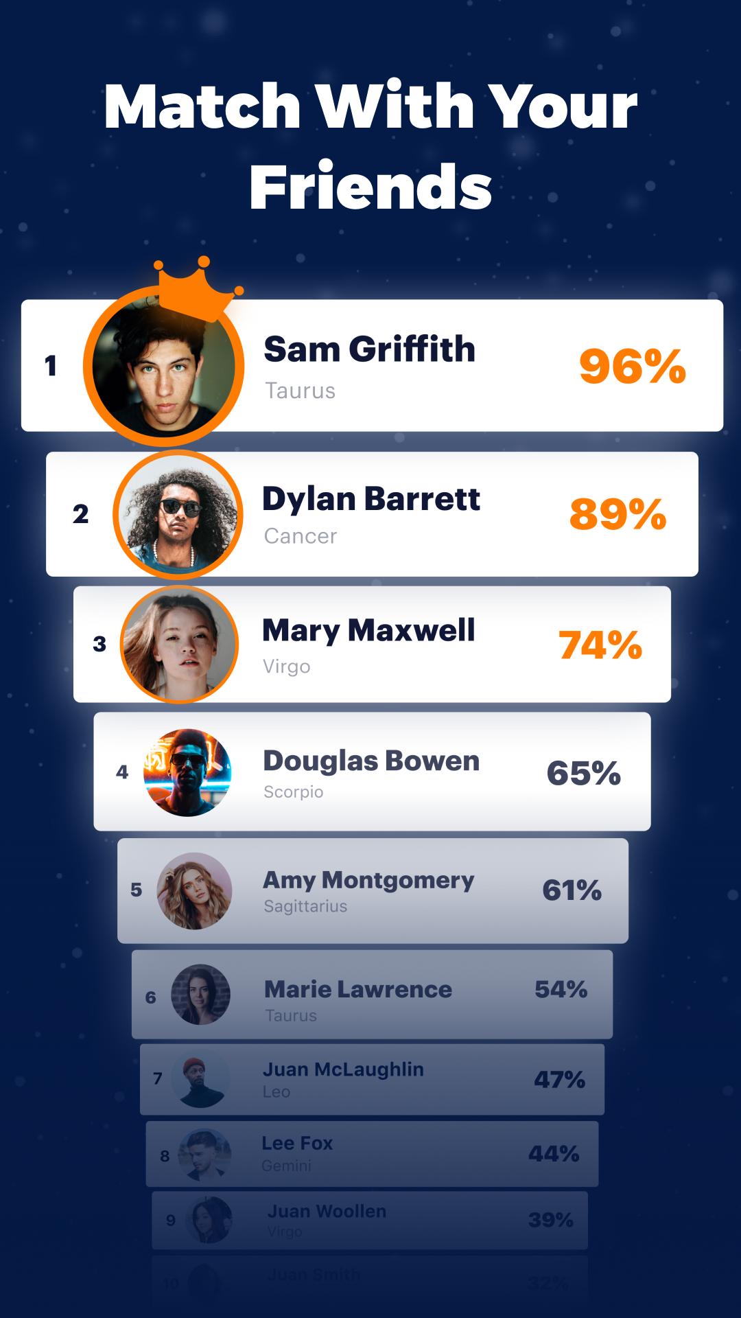 친구 나 사랑하는 사람과 호환되는지 알아 보려면 ZodiacMatch 에 초대하십시오. 둘 다 출생 차트를 만들면 차트와 얼마나 잘 어울리는 지 계산할 수 있습니다. 좋아하는 유명인과 얼마나 잘 어울리는지를 찾을 수 있습니다!