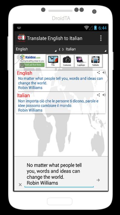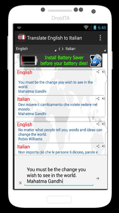 Translate English to Italian 이제 쉽습니다. 이 응용 프로그램을 사용하면 영어와 이탈리아어를 매우 빠르고 쉽게 번역하는 데 도움이됩니다. 이 응용 프로그램을 연구, 여행 또는 기타 제안에 사용할 수 있습니다.