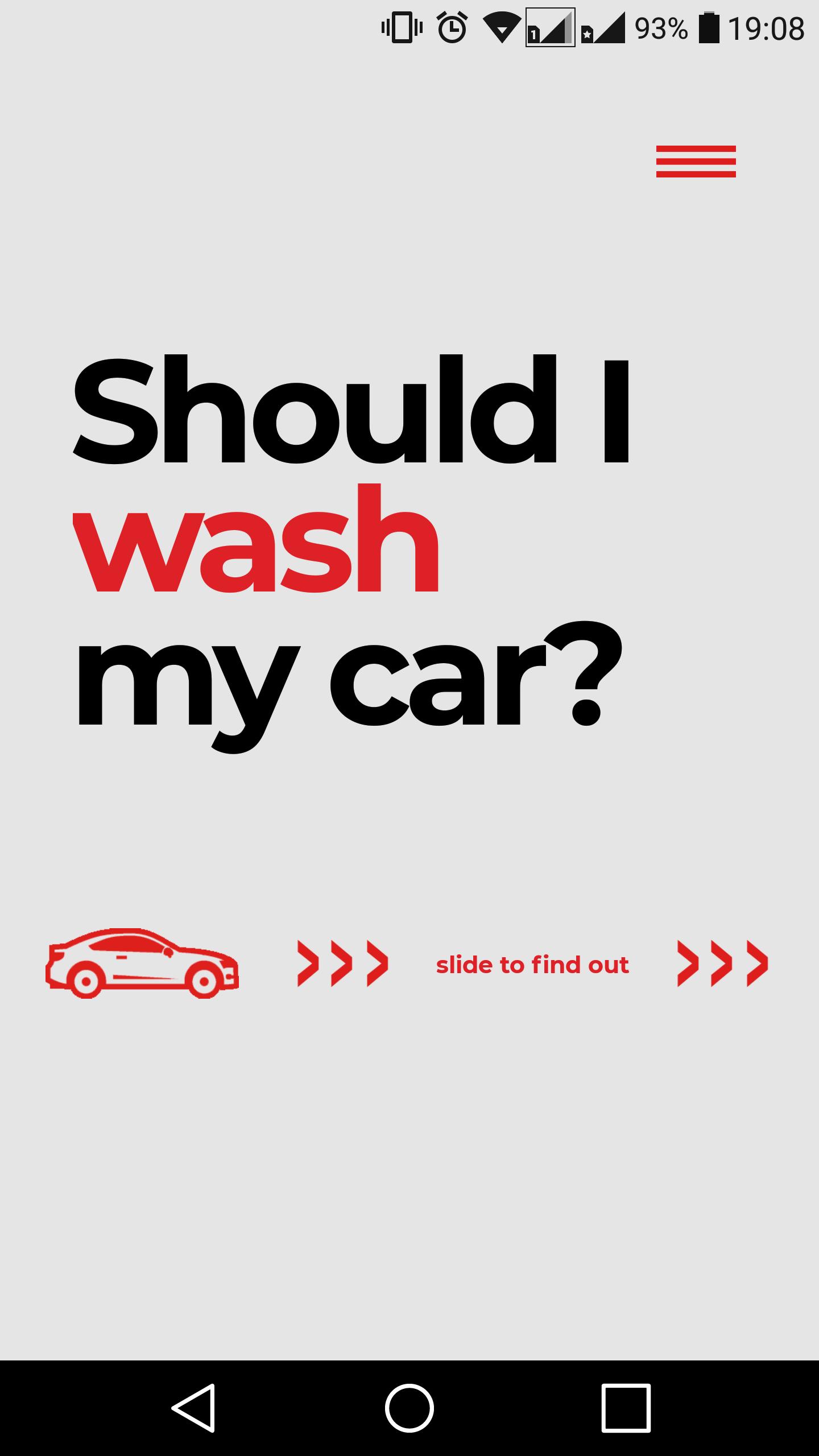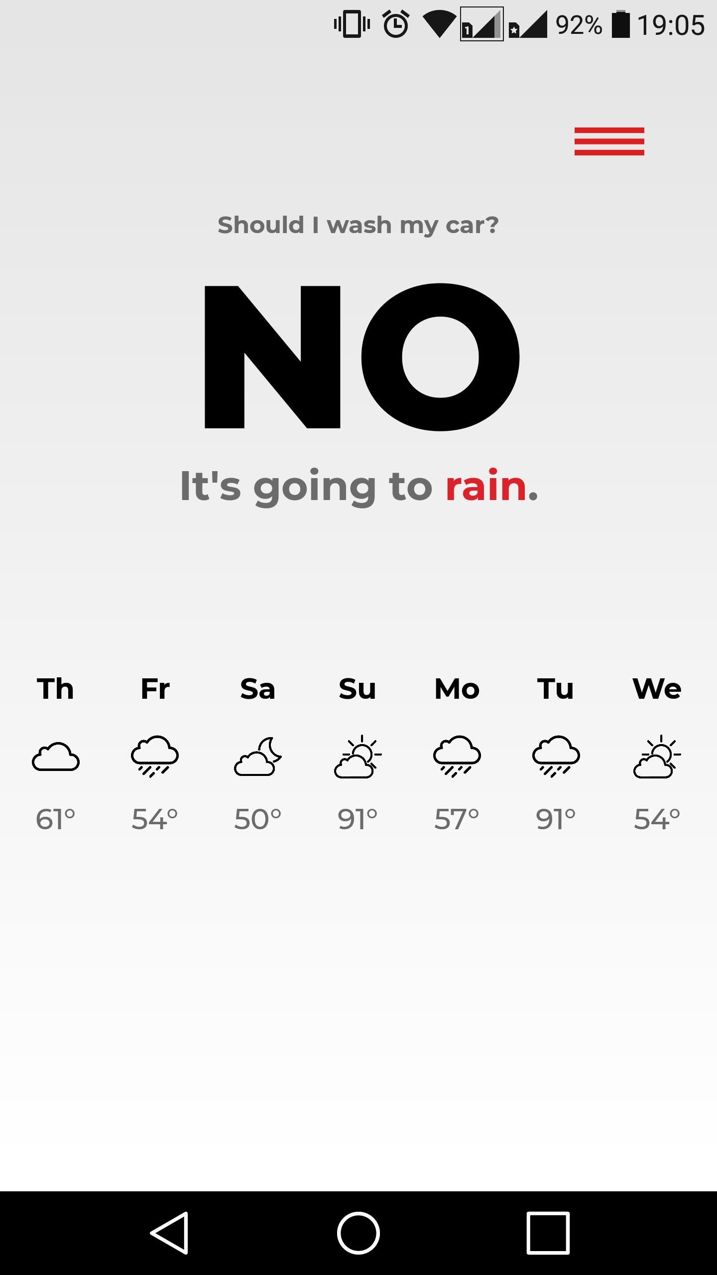 Washie 의 홈 화면은 7 일 예측을 제공하며 자동차를 씻어야하는지 여부에 대해 간단한 예 또는 아니오를 제공합니다. 다음 주에 비나 눈으로 예정되어 있다면, Washie 세탁을하지 말아야한다고 경고합니다.
