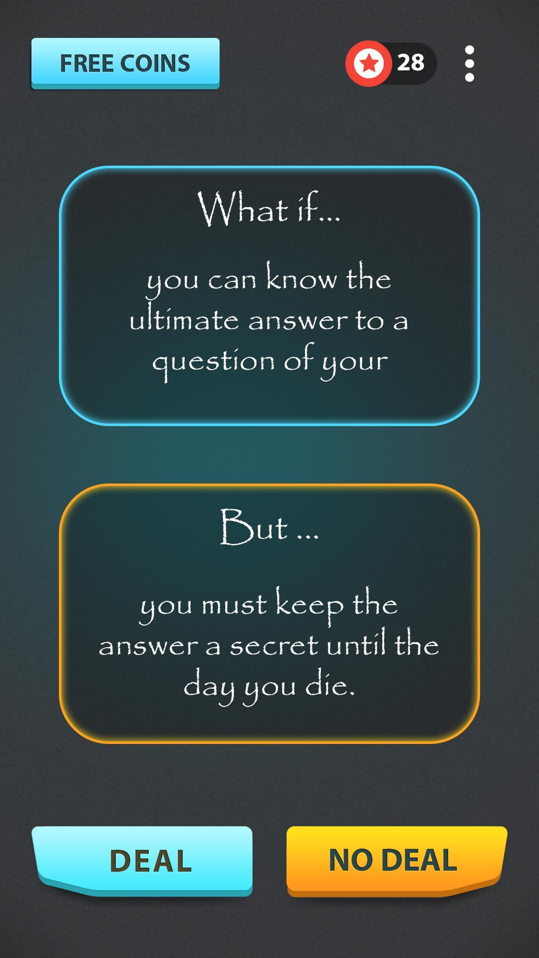 도전적인 질문에 대한 "거래"또는 "거래 없음"이라고 말하는 질문 게임.