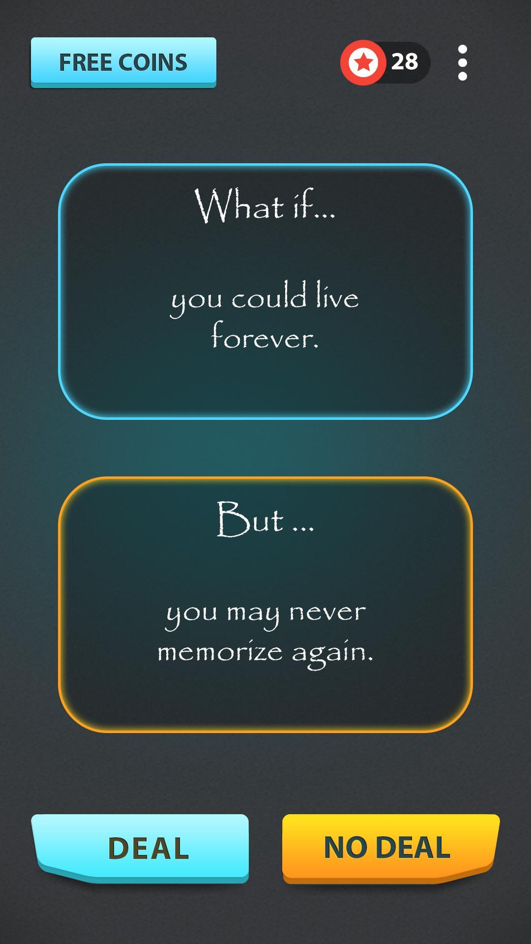 " Deal No Deal "은 캐주얼, 개인적, 도전적이며 미친 질문에 "거래"또는 "거래"라고 말하고 다른 플레이어가 어떻게 대답했는지 즉시 보는 질문 게임입니다! 파티와 시간을 통과하는 데 적합합니다. 당신은 잃을 것이 없습니다. 시도해보십시오!