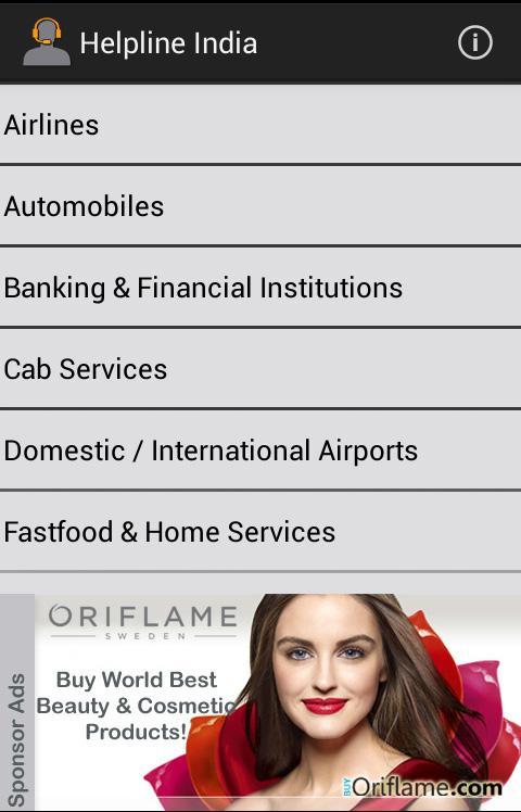 Helpline India é um aplicativo móvel offline, desenvolvimento para fornecer o número de suporte ao cliente de companhias aéreas, automóveis, instituições bancárias e financeiras, aluguel de carros, aeroportos indianos, fast food, empresas de TI e governo. Agências, seguros, serviços móveis e telecomunicações, ONG, Comissão de Serviço Público, Instituição Educacional, Courier e Universidade e Conselhos.