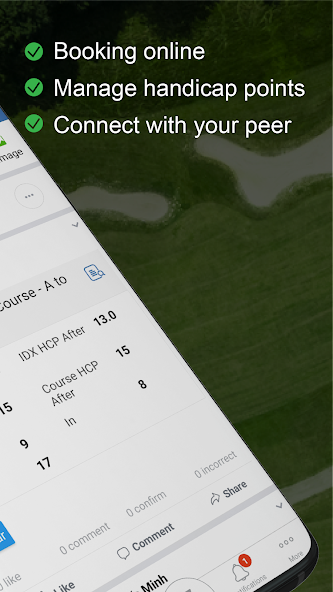 Meça a distância pelo GPS, compartilhe seu handicap, scorecard via rede social de golfe
