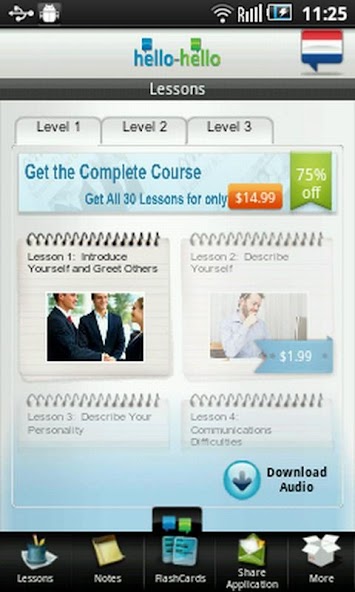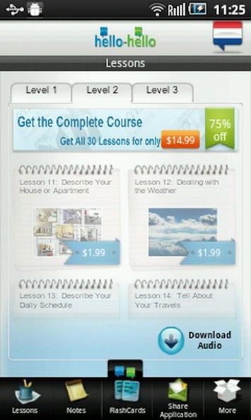 Hello-Hello Dutch é um curso de idioma completo, com 30 lições desenvolvidas em colaboração com o Conselho Americano de Ensino de Línguas Estrangeiras (ACTFL), para que você possa ter certeza de que essas lições seguem uma metodologia eficaz baseada em pesquisa. Todas as lições são conversacionais com base em diálogos e situações realistas, em vez de uma coleção de palavras e frases fora de contexto.