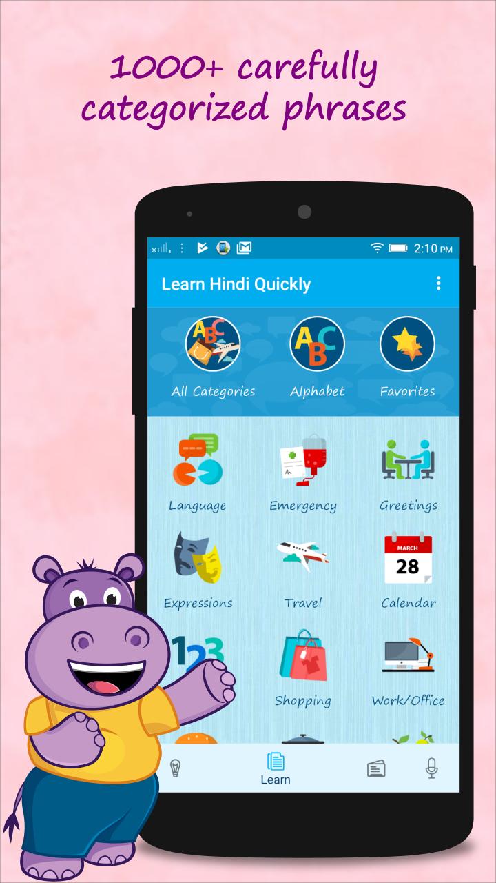 Se você estiver determinado a aprender em hindi uma categoria específica de palavras, Learn Hindi Quickly . Ele fornece tradução para hindi para palavras e frases mais frequentemente usadas em 33 categorias. Você pode usá -lo como um dicionário de inglês para hindi para mais de 1100 palavras e frases de vocabulário mais comumente usadas. É realmente uma ótima ferramenta útil que permitirá que você tenha uma conversa em hindi facilmente.