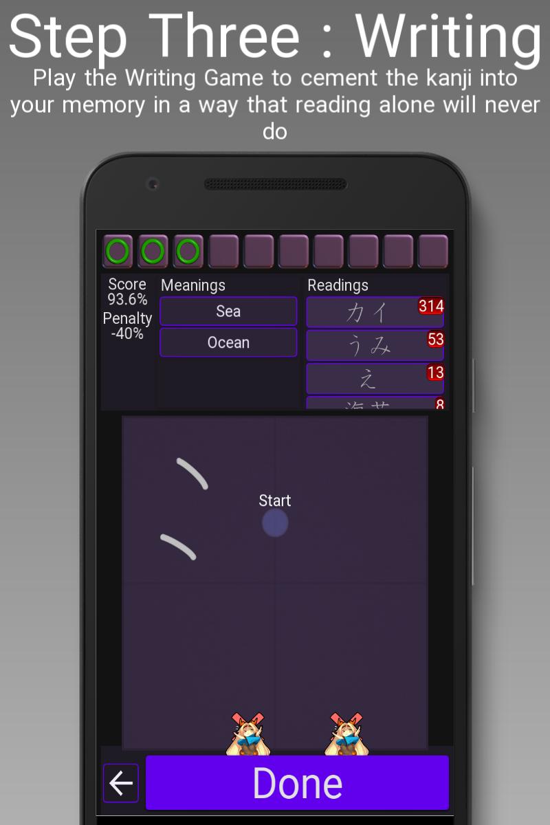 O processo de aprendizado é dividido em três estágios naturais. O primeiro é uma introdução suave que treina a área de correspondência de padrões em seu cérebro para reconhecer formas de Kanji. Ao focar nessa atividade, você se surpreenderá com a poderosa suas próprias habilidades de aprendizado.