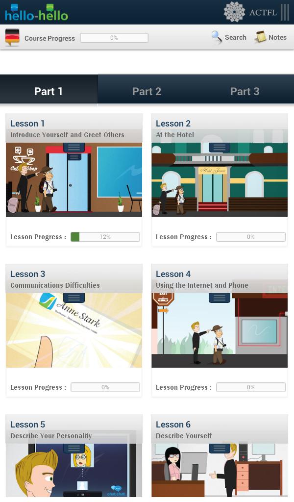 Habilidades de comunicação: Aprenda a se comunicar efetivamente com a Lição 1! Aprenda alemão com Hello-Hello oferece 30 lições de conversação com base em situações da vida real, e não em uma coleção de palavras e frases fora de contexto. Os diálogos são apresentados e depois divididos em frase por frase, onde você pode praticar habilidades de pronúncia e escrita