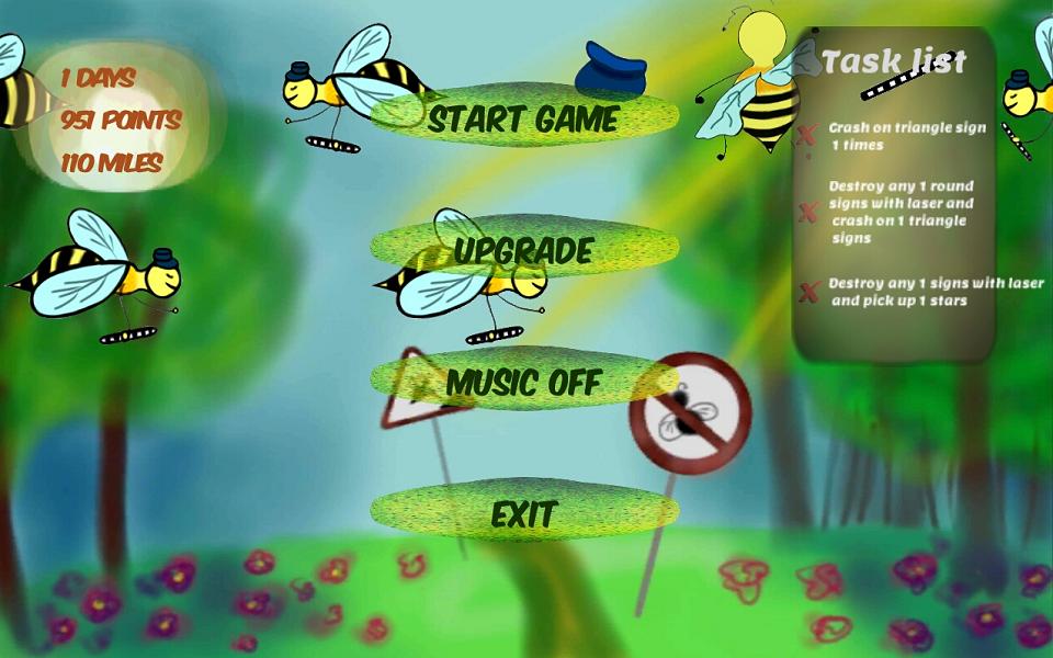 Os pontos ganhos podem ser gastos na guia "Upgrade", melhorando uma das três habilidades da abelha. A primeira habilidade é o laser, com ele, você pode matar sinais de estrada e abelhas ruins irritantes. A segunda habilidade é a esfera protetora, ela o protegerá completamente das abelhas ruins por algum tempo. A terceira habilidade é uma vida de bônus, se você colidir com qualquer sinal, poderá continuar seu voo. Se você não tem pontos suficientes para algo, está tudo bem! Você pode encontrar a placa com uma variedade de tarefas na guia "Menu". Execute -os e obtenha muito mais pontos de uma só vez!