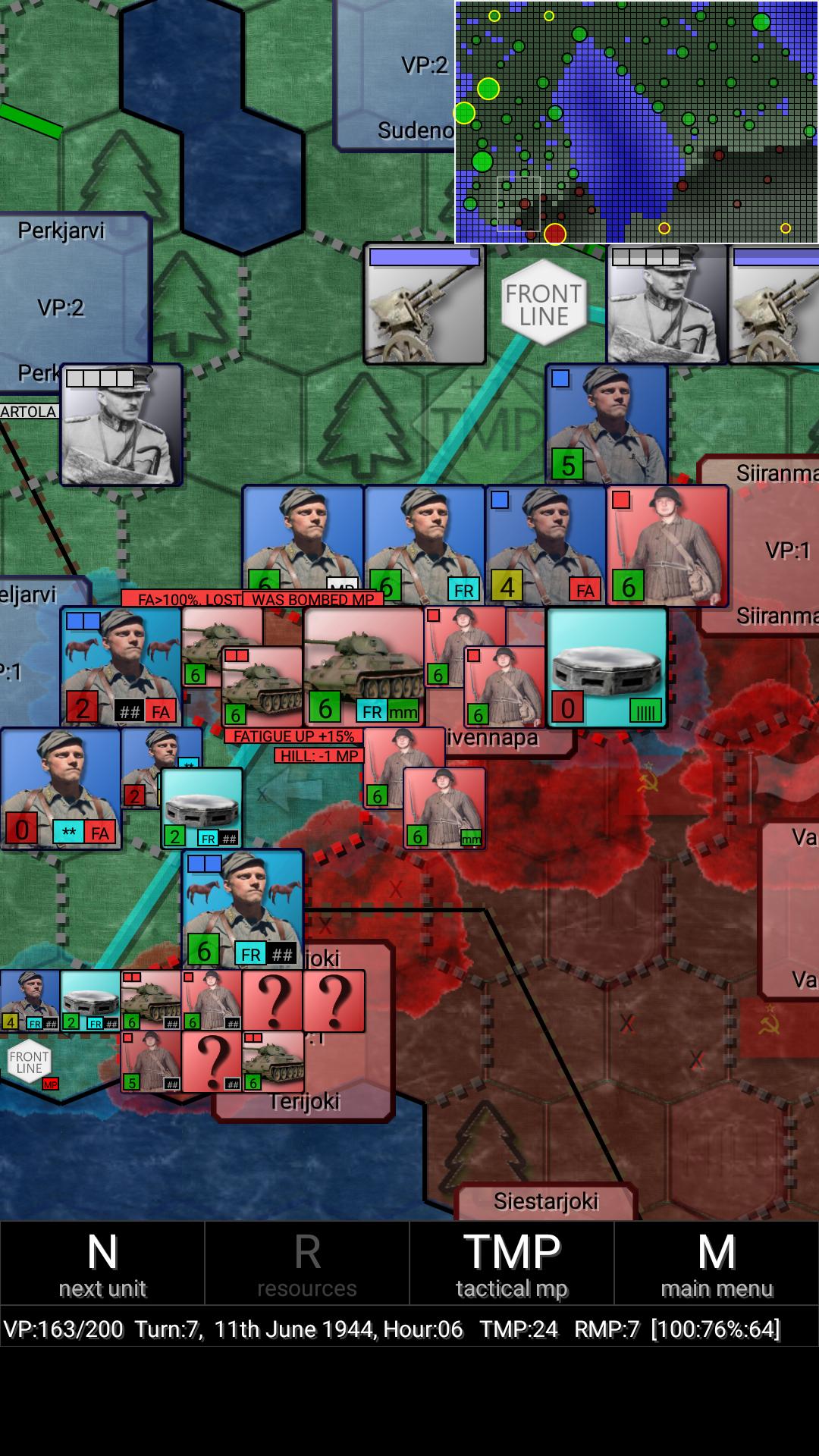 Você pode liderar as forças finlandesas brilhantes o suficiente para impedir a enorme ofensiva do Exército Vermelho, que pretendia derrubar a Finlândia da Segunda Guerra Mundial? Os anos de 1942-1944 ficaram silenciosos na parte finlandesa da frente oriental: os soldados fizeram madeira, poucos viram combate, lugares errados da linha de frente foram fortificados-tudo isso enquanto o Exército Vermelho estava tendo lições na guerra moderna de Wehrmacht. Quando a greve soviética finalmente caiu no verão de 1944, foi um enorme ataque bem praticado por um exército completamente treinado com barragens de artilharia sem precedentes - contra os finlandeses que haviam acabado de estender folhas de férias de verão. O jogo termina quando você controla todos os pontos de vitória ou depois de perder o controle de todo o VPS (você manteve o maior tempo possível).