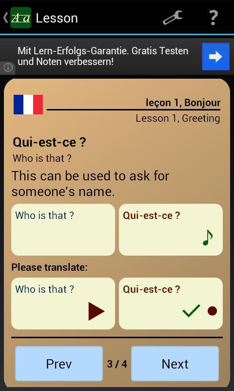 Вы изучаете язык на ежедневных базах на уроках с простыми фразами. Приложение представляет макс. один урок в день. Следующий урок будет доступен на следующий день после того, как вы закончили предыдущий. Вы можете пройти курс языка в путешествие или в деловую поездку и продолжить обучение, используя наши карточки со словами и фразами.