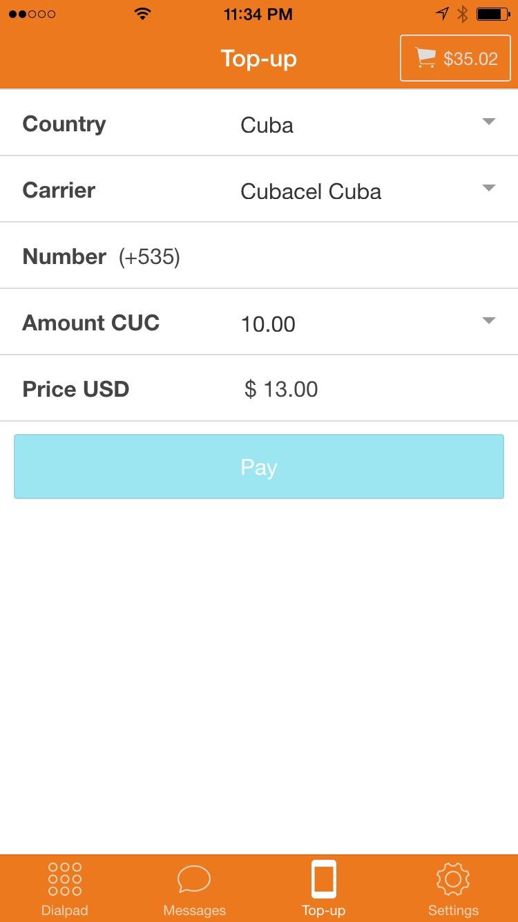 Самый дешевый способ позвонить на Кубу (42 цента/мин): $ 5 = 12 мин, 13 долларов США = 30 мин, 25 долларов США = 60 мин.