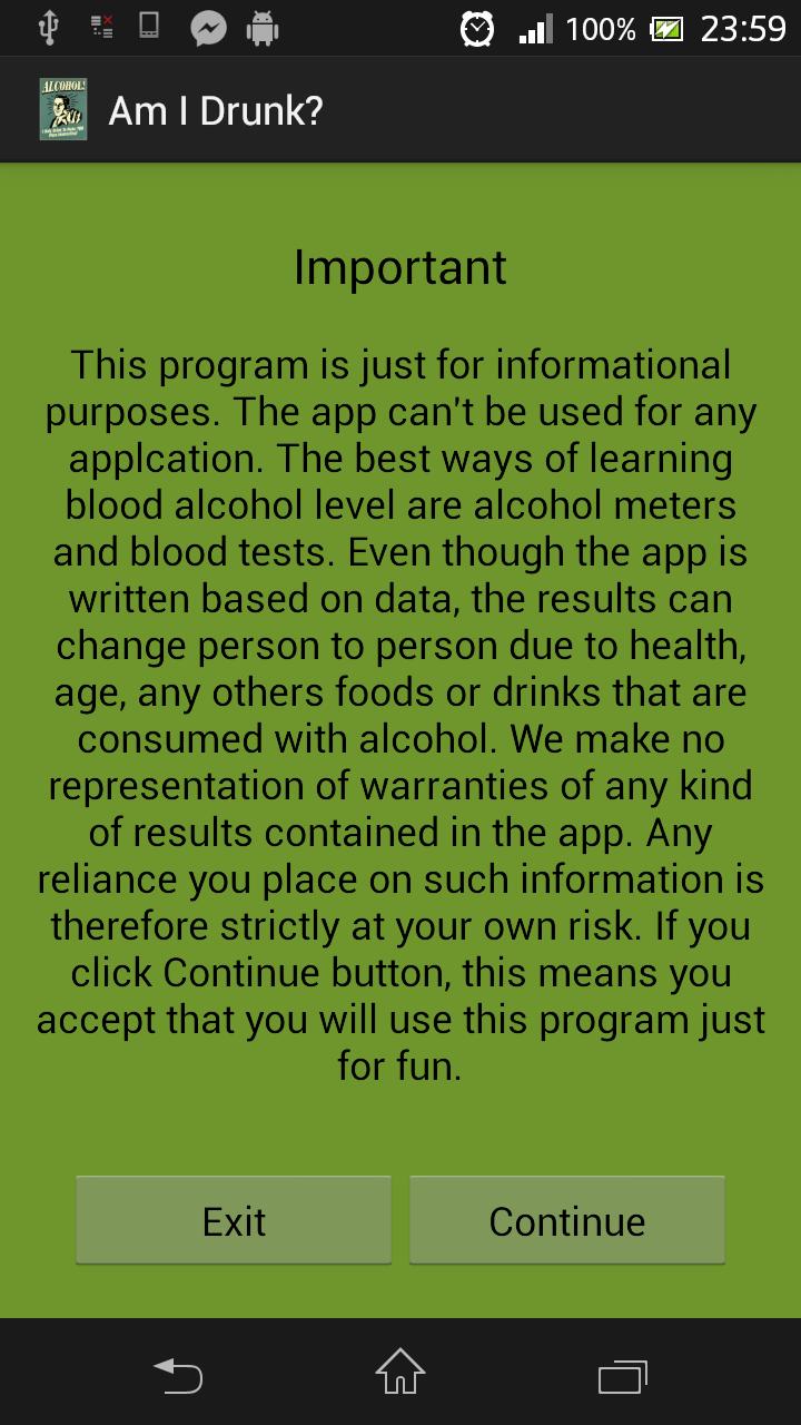 Примечание: эта программа предназначена только для информационных целей. Приложение не может быть использовано для любой прикладки. Лучшие способы изучения уровня алкоголя в крови - это счетчики алкоголя и анализы крови. Несмотря на то, что приложение написано на основе данных, результаты могут изменить человека на человека из -за здоровья, возраста, любых других продуктов питания или напитков, которые употребляются с алкоголем. Мы не представляем гарантии каких -либо результатов, содержащихся в приложении. Поэтому любая зависимость от такой информации строго находится на вашем собственном риске.