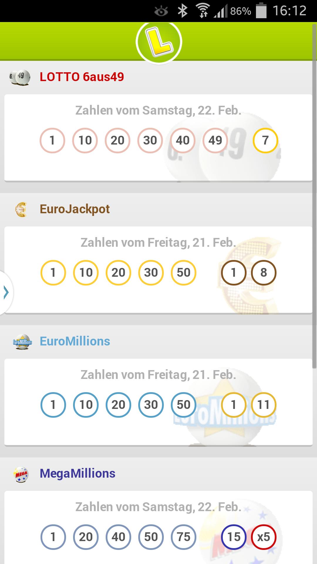 Все это для немецкой классической лото 6AUS49, а также для Euromillions и Eurojackpot. Кроме того, с американскими записями джекпотов мегамиллионов и пауэрбола.