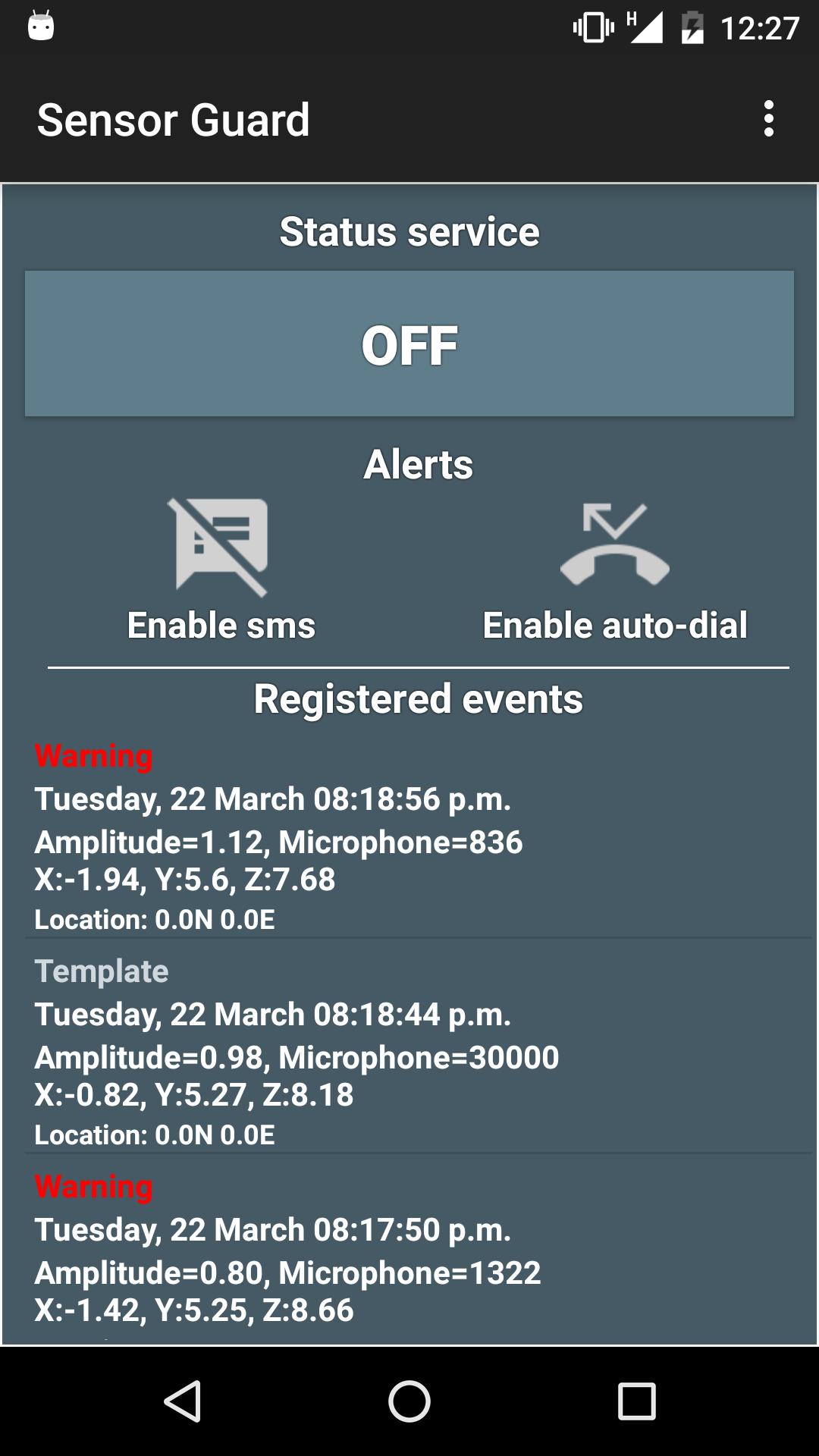 Программа записывает влияние на автомобиль (Hit, перемещение, удаление колеса, эвакуация автомобилей) и предупреждает SMS -сообщение или вызывает владельца в различных ситуациях, в зависимости от настройки (проверка амплитуды колебаний). Для приложения нужен смартфон с модулем датчика акселерометра, GPS / Glonass и версией Android 4.0.3 (API 15) и выше.