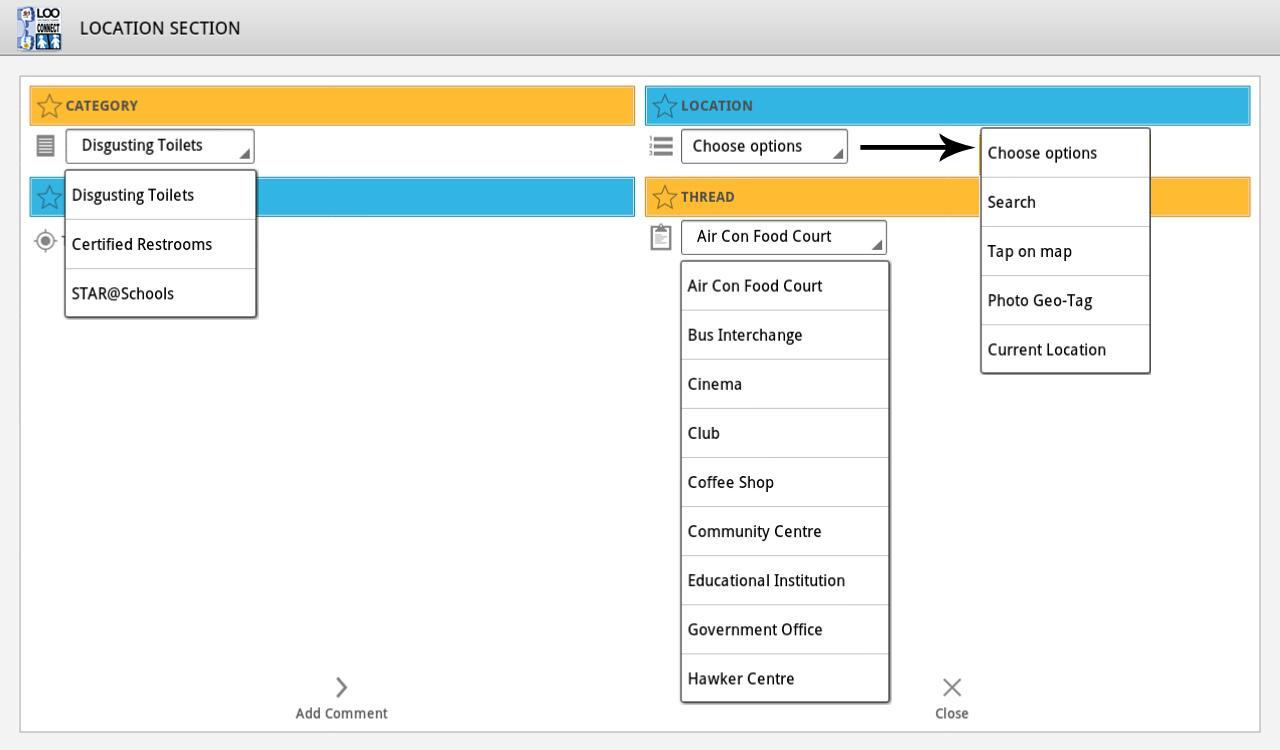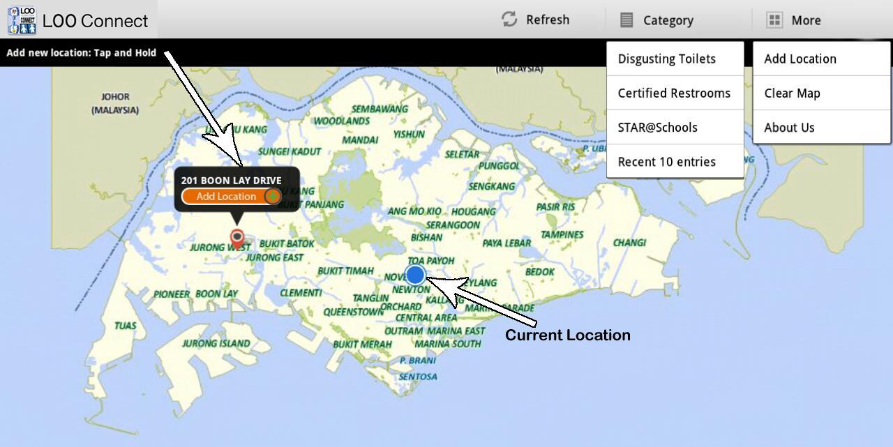 Loo (давайте соблюдаем себя) Connect - это инициатива Ассоциации туалетов (Сингапур) или RAS. Он использует плагин OneMap, который позволяет общественности найти более 200 чистых туалетных мест, сертифицированных RAS, а также выступает в качестве канала обратной связи туалета для общественности, чтобы предоставить комментарии либо добавления новых местоположений, либо разместив комментарии в существующих местах. Прежде чем добавить новое местоположение, пользователи должны указать тип туалетного оператора, такого как обмен автобусами, кафе, фуд -корт, центральный центр, станция MRT и т. Д.