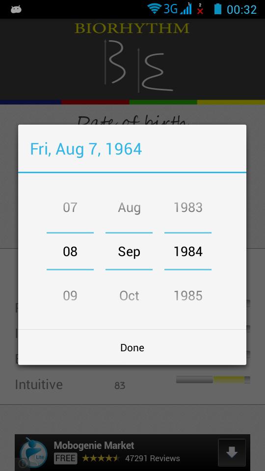Программа позволяет вам рассчитать личные прогнозы биоритма для выбранной даты.