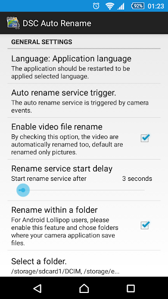 Как и в случае с Kitkat, приложение может переименовать файлы из внутренней памяти. Для внешней памяти следует включить «переименование в папке» и должна быть выбрана, какая папка используется приложением вашей камеры для сохранения файлов. Для последовательности, пожалуйста, выберите также папки из внутренней памяти.
