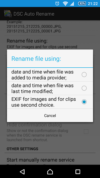 Я сделал это приложение для переименования изображений и клипов с моего телефона Sony Xperia V автоматически в зависимости от даты и времени файла, от dsc_0001.jpg или mov_0001.mp4 до 20150414_213616.jpg или 20150414_090523.mp4.