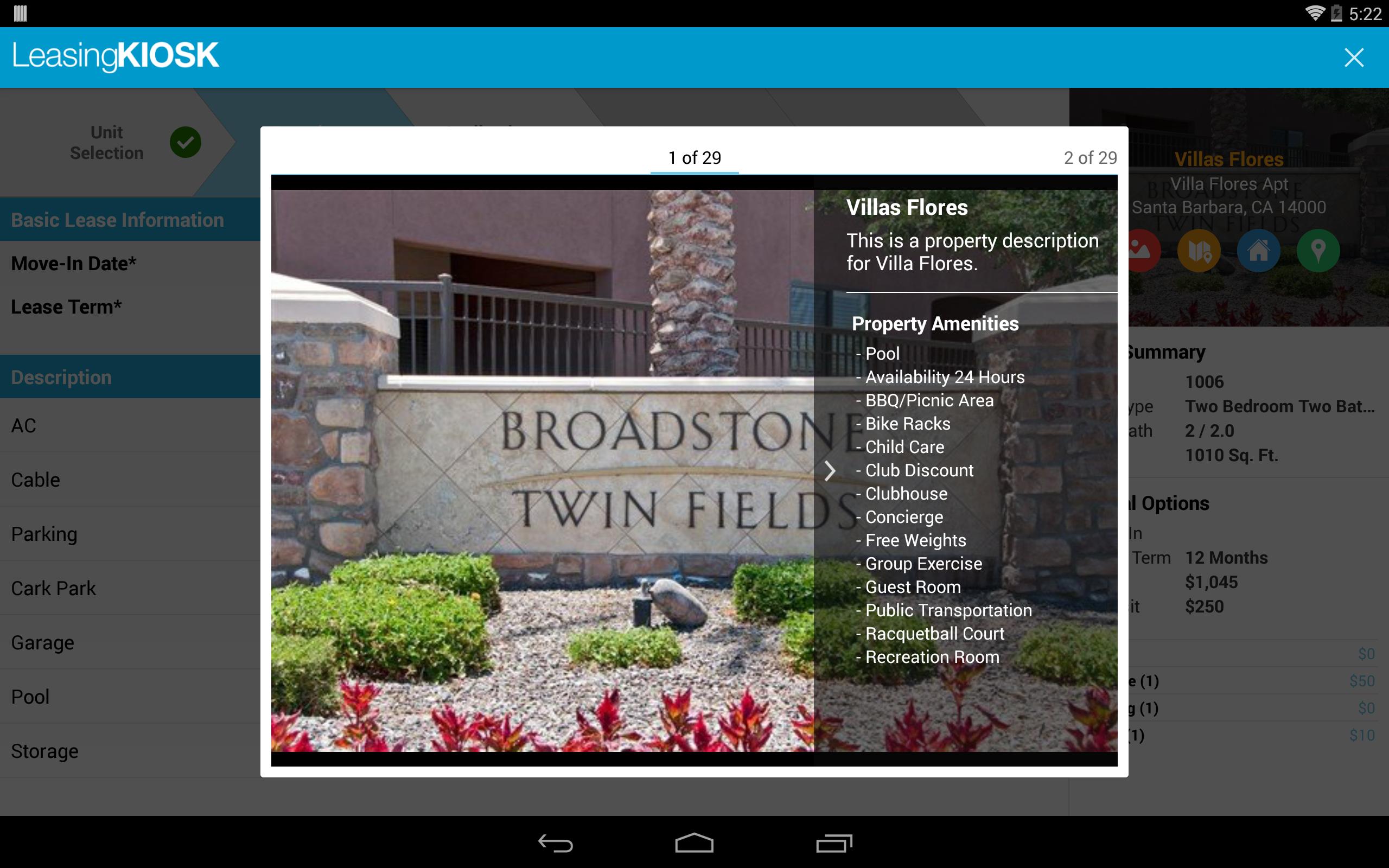 LeasingKIOSK позволяет лизинговым агентам передавать свои таблетки Android потенциальным жителям без ущерба для конфиденциальной информации. Это приложение, ориентированное на потребителя, позволяет перспективам быстро применять, платить любые требуемые сборы и подписывать аренду, все за один заседание.