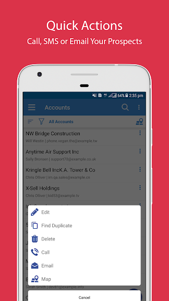 มันมีไว้สำหรับพนักงานของ บริษัท เท่านั้น แอพซอฟต์แวร์ธุรกิจ CRM ช่วยในการจัดการกิจกรรมทางธุรกิจประจำวันได้อย่างง่ายดาย แอพนี้สามารถปรับปรุงประสิทธิภาพการทำงานการจัดการการรายงานสำหรับผู้ใช้ แอพมีงานมากมายเช่นบัญชี, ตะกั่ว, ใบเสนอราคา, เช็คอิน/ออก, การประชุม, งาน ฯลฯ