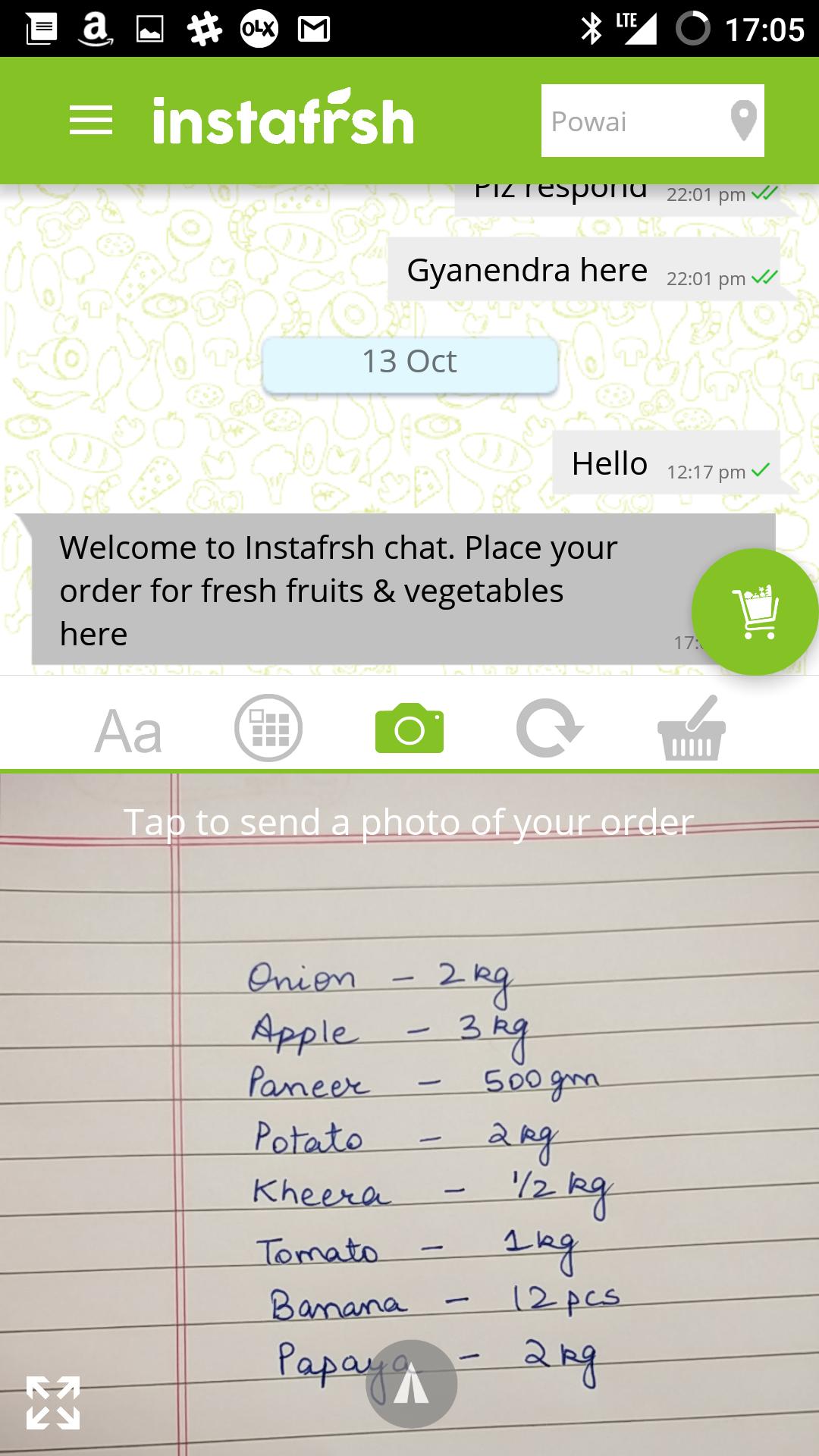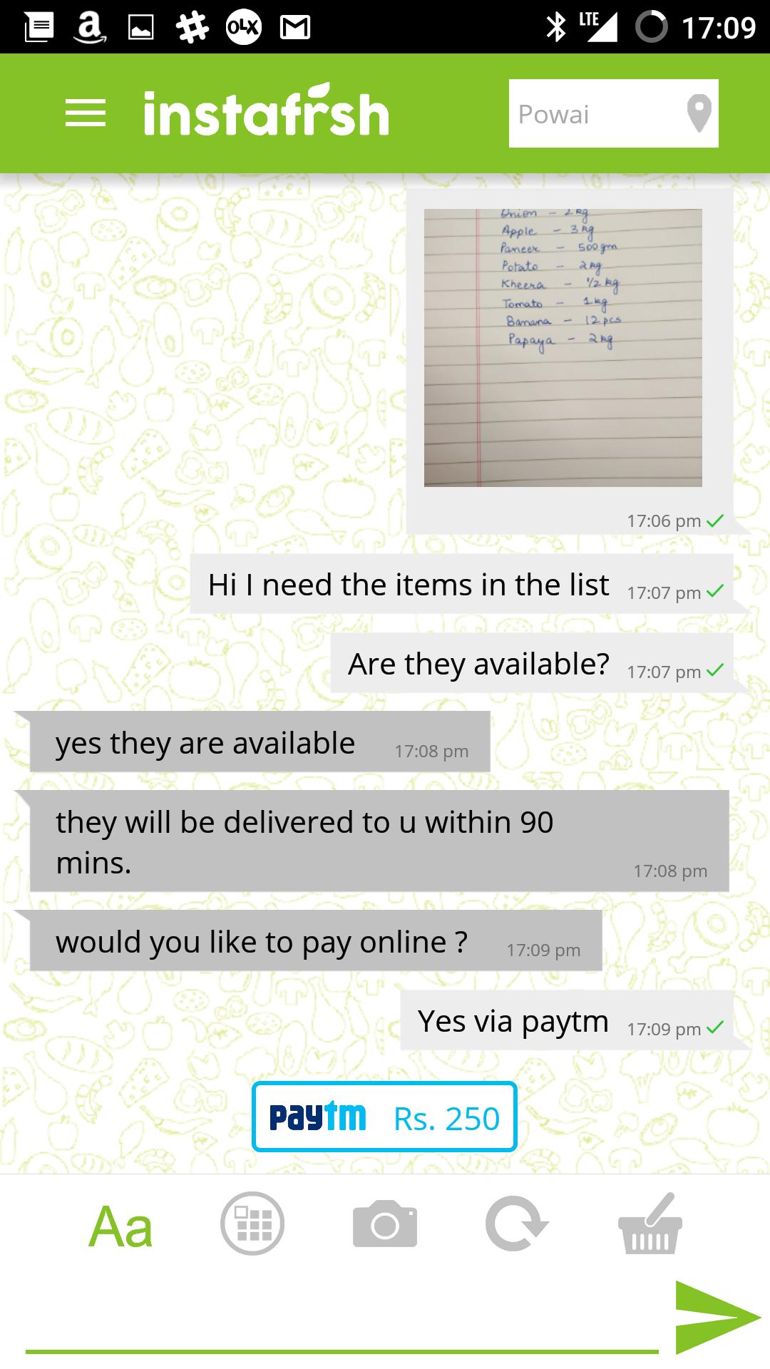 instafrsh -Chat ทำให้ผู้บริโภคสามารถปรับแต่งสินค้าตามลำดับได้ง่ายมาก ข้อความสองสามข้อความที่มีตัวแทนสมาร์ทแชทของ instafrsh คือสิ่งที่คุณต้องได้รับผลไม้และผักสดของคุณส่งไปยังหน้าประตูบ้านของคุณ มันให้การส่งมอบบ้านฟรีสำหรับคำสั่งซื้อทั้งหมดของคุณ