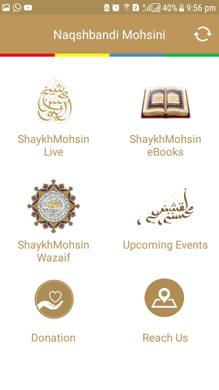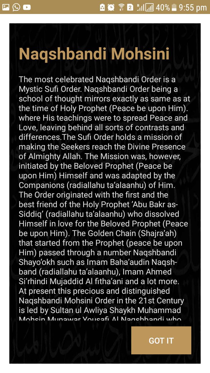 ผู้เผยพระวจนะศักดิ์สิทธิ์ 'อาบูบากร์เป็น-siddiq' (Radiallahu ta'alaanhu) ที่ละลายตัวเองด้วยความรักที่มีต่อผู้เผยพระวจนะที่รัก (สันติภาพจงมีแด่เขา) โซ่ทอง (Shajra'ah) ที่เริ่มต้นจากศาสดา (สันติภาพจงมีแด่เขา) ผ่านหมายเลข Naqshbandi Shayo'okh เช่นอิหม่าม Baha'audin Naqshband (Radiallahu Ta'alaanhu) อิหม่ามอาเหม็ด Si'rhindi Mujaddid al Fitha'ani ในปัจจุบันคำสั่ง Naqshbandi Mohsini ที่มีค่าและมีชื่อเสียงในศตวรรษที่ 21 นำโดย Sultan Ul Awliya Shaykh Muhammad Mohsin Munawar Yousafi al Naqshbandi ผู้ฟื้นฟูความรักที่แท้จริง khi'dmat (บริการ)