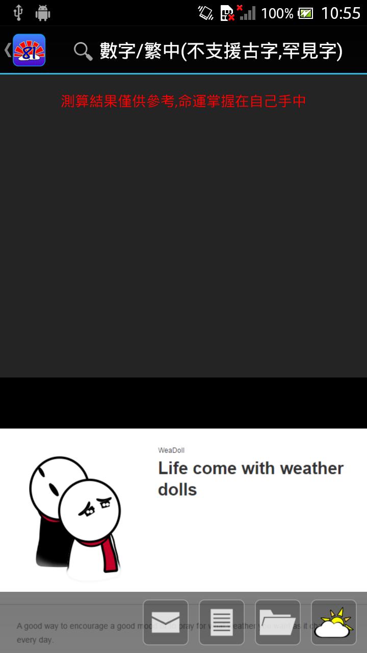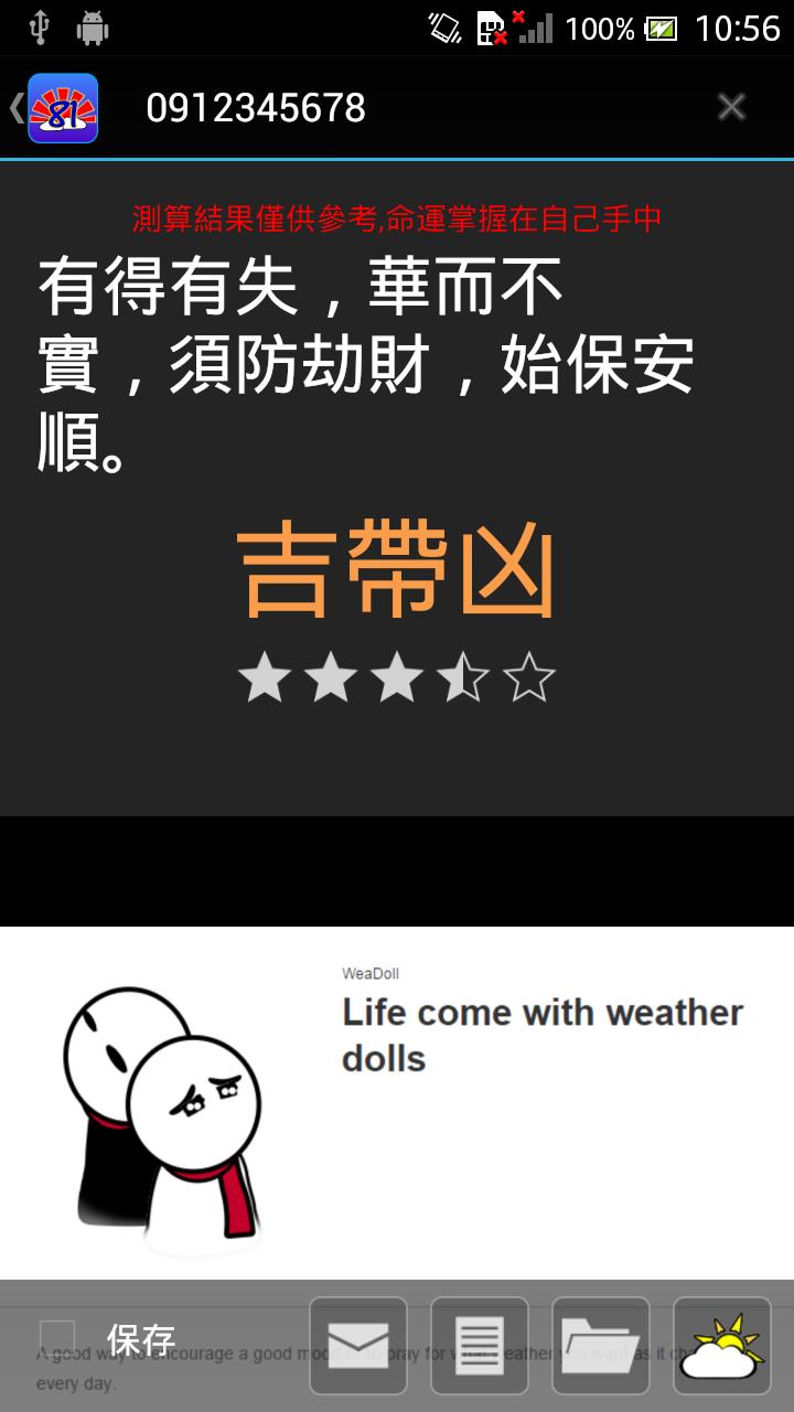 โชคดีในวัฒนธรรมจีน สนับสนุนดิจิตอลและจีนดั้งเดิมเท่านั้น ผลลัพธ์สามารถจัดเก็บและแก้ไขได้ ด้วยแอพนี้คุณสามารถค้นหาจำนวนทั่วไปที่ดีและไม่ดี 81 หลักในชีวิตประจำวันของคุณเช่นหมายเลขโทรศัพท์หมายเลขป้ายทะเบียนชื่อจีนชื่อ บริษัท จีนหรือชื่อแบรนด์จีนเป็นต้น