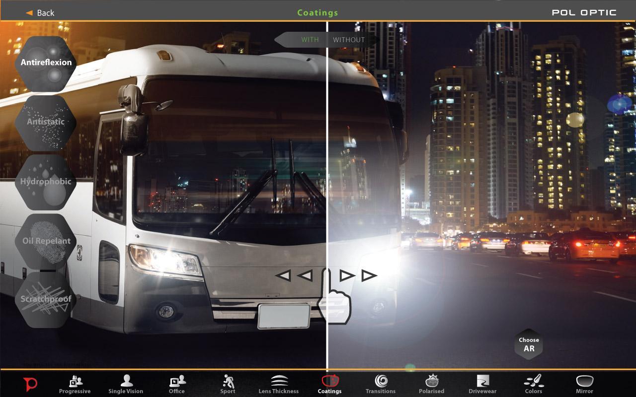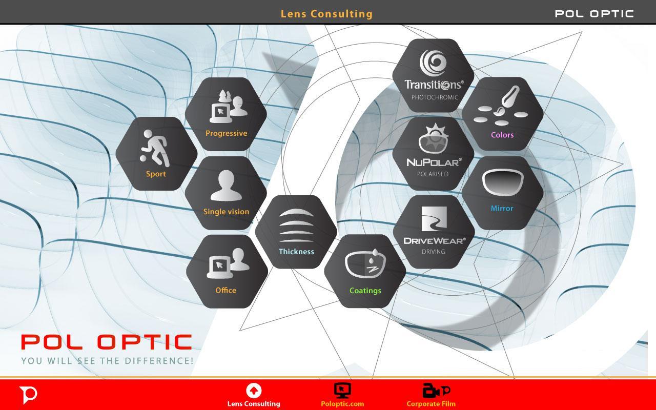 Pol Guide เป็นแอปพลิเคชันที่สร้างขึ้นโดย Pol Optic เพื่อช่วยให้นักออทิติกแสดงให้เห็นถึงความแตกต่างระหว่างวัสดุเลนส์ประเภทดัชนีและการเคลือบ