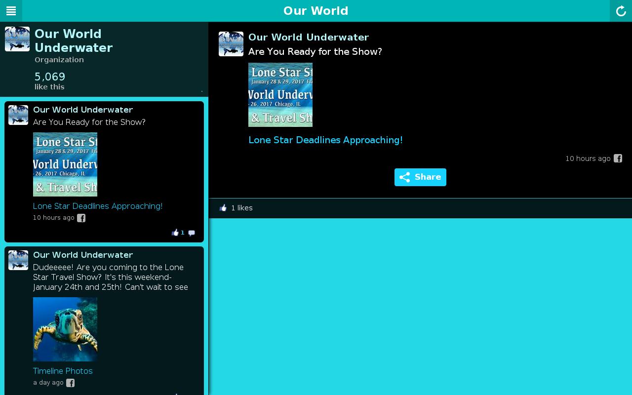 น้ำโลกของเราคือการแสดงดำน้ำและการเดินทางที่ใหญ่ที่สุดในมิดเวสต์ บูธหลายแห่งการนำเสนอที่ให้ความบันเทิงและกิจกรรมสำหรับทั้งครอบครัว