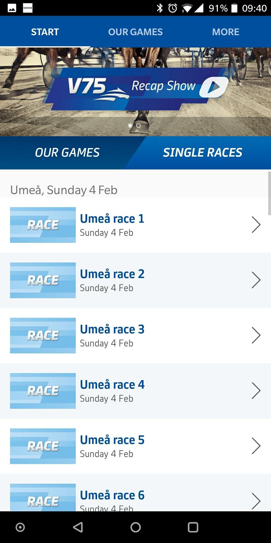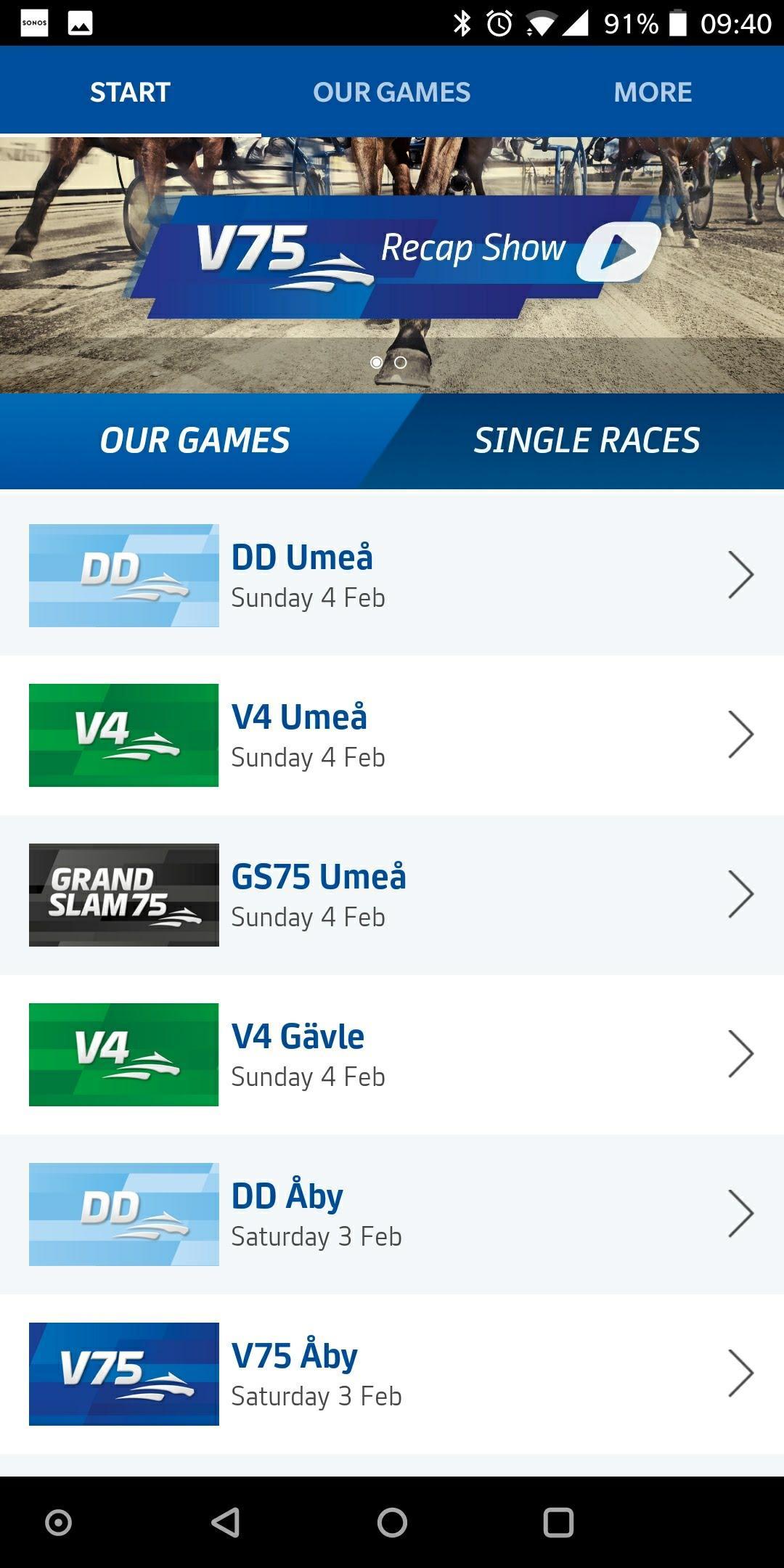 - วิดีโอซ้ำของการแข่งขันหลักทุกวันจากกิจกรรมที่มี V75, GS75, V86, V65, V64 และ V4
