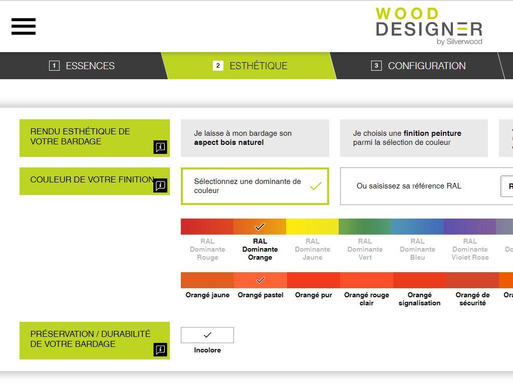 在非常简单的4个步骤中,选择特征(木材汽油,美学渲染,配置文件,配件),然后立即获得项目的精确成本。通过创建您的帐户,您还可以保存配置,请求样本并访问木材覆层的真实时间可视化。