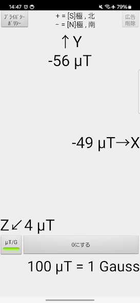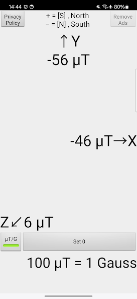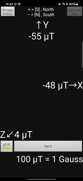 使用三维磁力计测量微型特斯拉(μT)单元中磁铁通量密度的游离磁铁仪表应用程序。屏幕的上侧是X轴,屏幕的右侧是Y轴,屏幕的前侧是Z轴。磁铁S极是正的,磁铁N极是负的。向北的最大值,向南的最小值。 100μt= 1高斯October 20, 2025