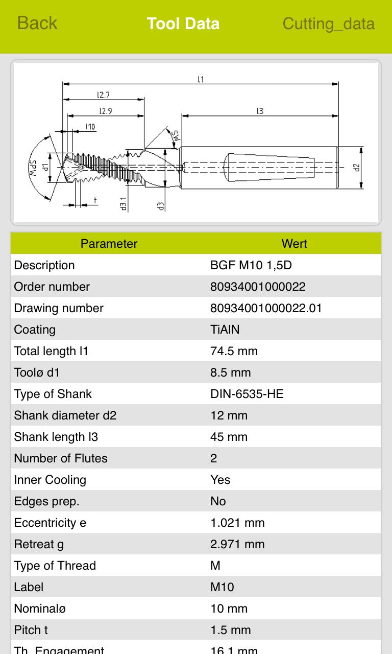 输入螺纹应用程序后, TPT mobile会为您列出所有合适的标准螺纹铣刀、相应的钻头/螺纹铣刀。