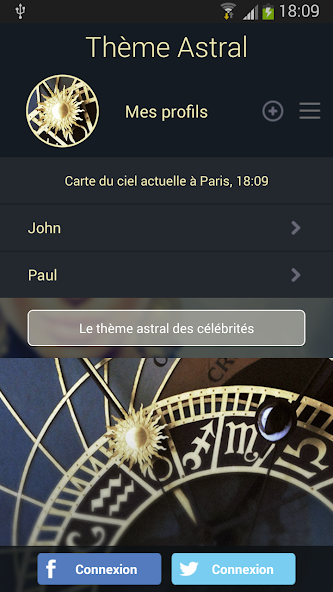 出生图表应用程序是直观且易于使用的。您可以同时处理几个个人资料:您的浪漫伴侣,朋友,家人和专业联系人的个人资料。天空图,也称为星形图或星图,对于所有希望了解更多有关自己并克服某些障碍的人以及学习如何与他人一起行动的人都是必不可少的帮助。