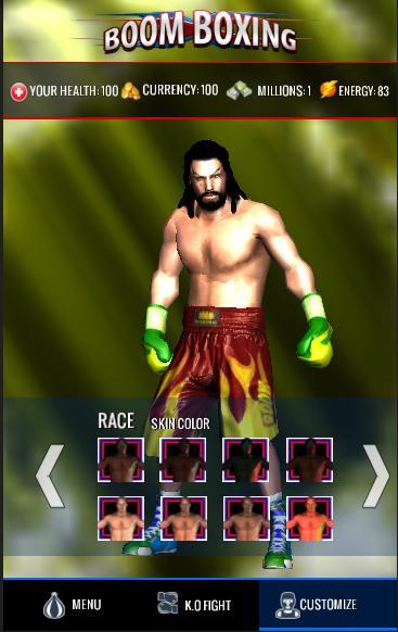 创建自己的战斗机。从各种皮肤,身体类型和纹身中选择最适合您的方法。选择自己的身高,年龄和国家。使用您自己的自定义播放器进入戒指,并向世界展示您的成就。