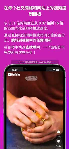 快速以0.05倍的精度更改速度。不要受1.25x / 1.5x / 1.75x和2x的標準速度限制。將任何速度從0.07倍設置為16倍,其精度為0.01x。如果您不滿意1.75倍,但可以處理1.70倍,那麼觀看1小時視頻時,您將節省13%的時間(即5分鐘)。