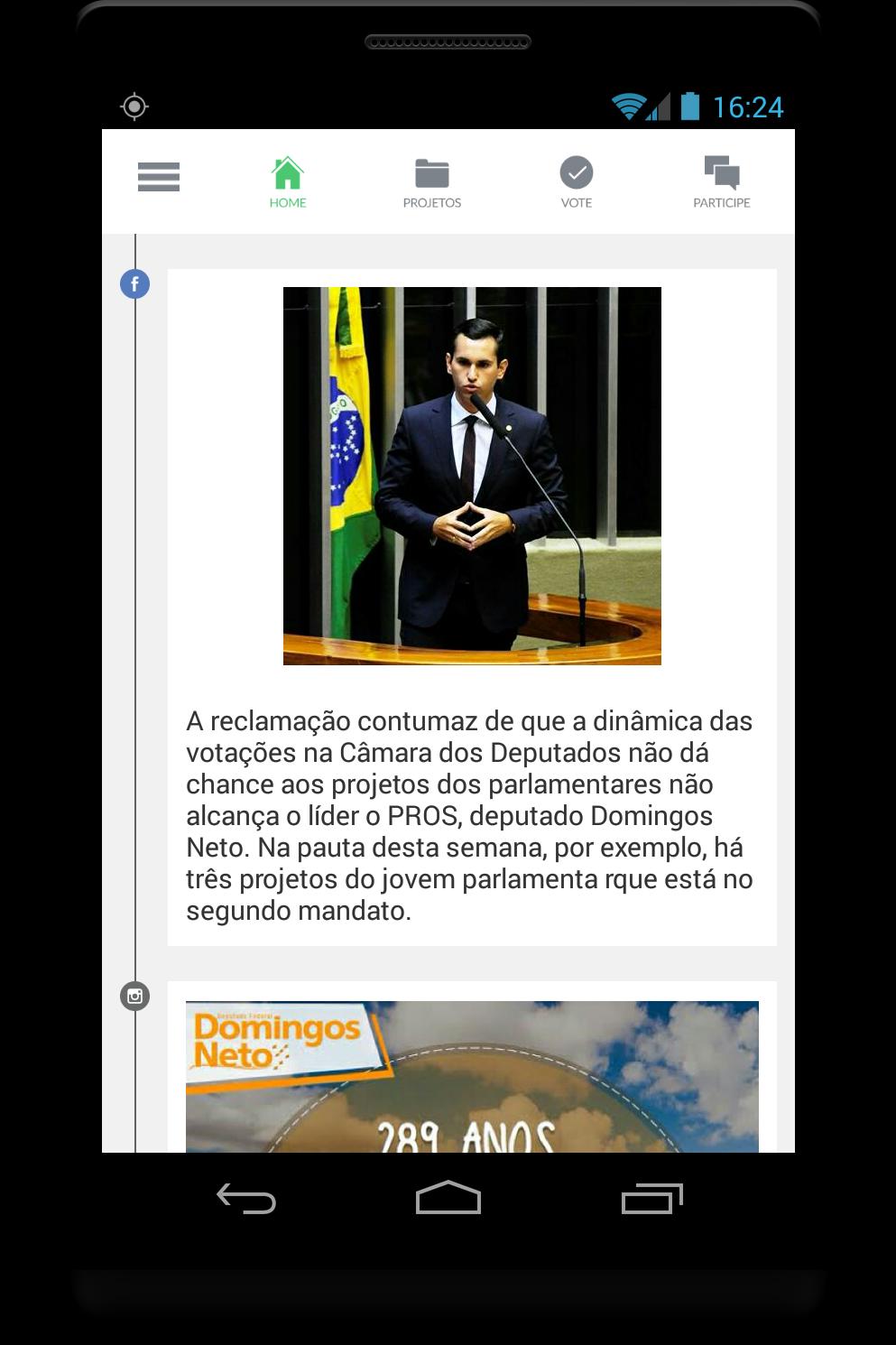 Domingos Neto應用程序旨在了解其人民的需求,並邀請所有人一起參加這次步行,以建立一個更好的國家。該申請為公民提供了一些資源,可以在法律項目中行使其公民身份,並在法律項目中進行投票,並在單個時間表中與代理人的社交網絡有關。