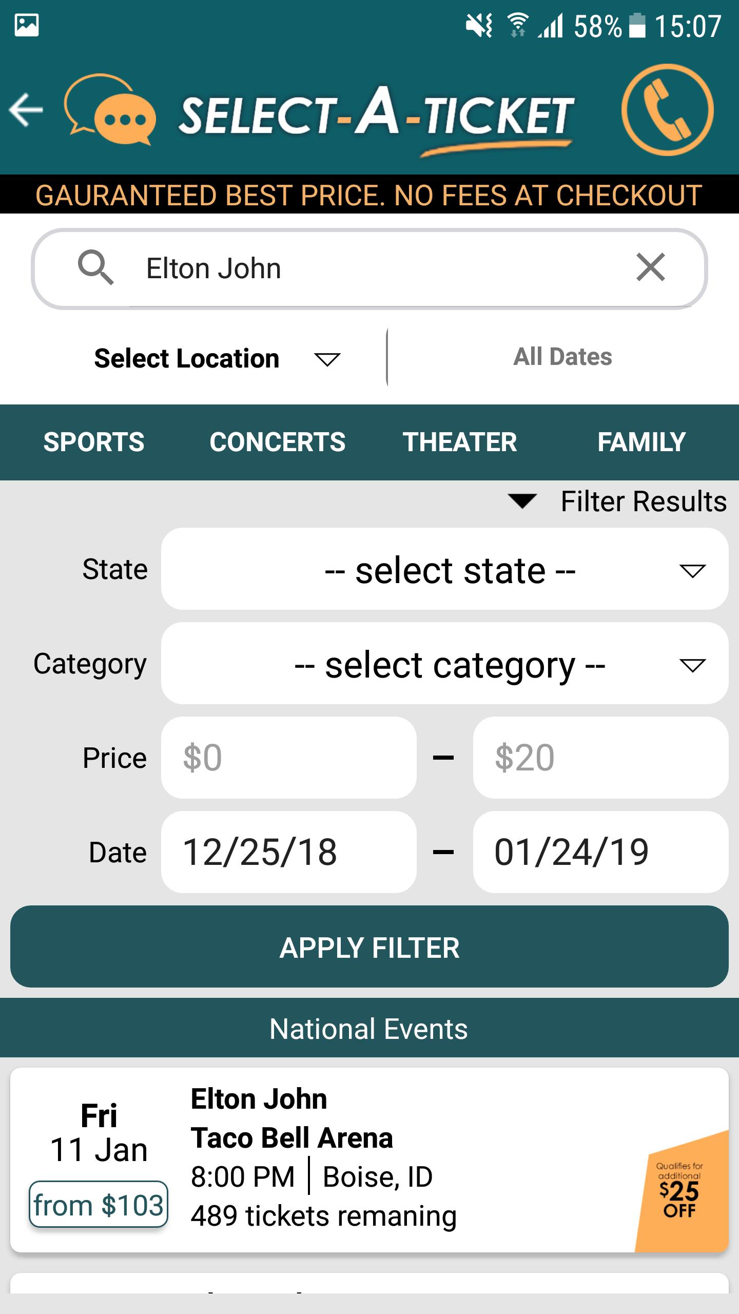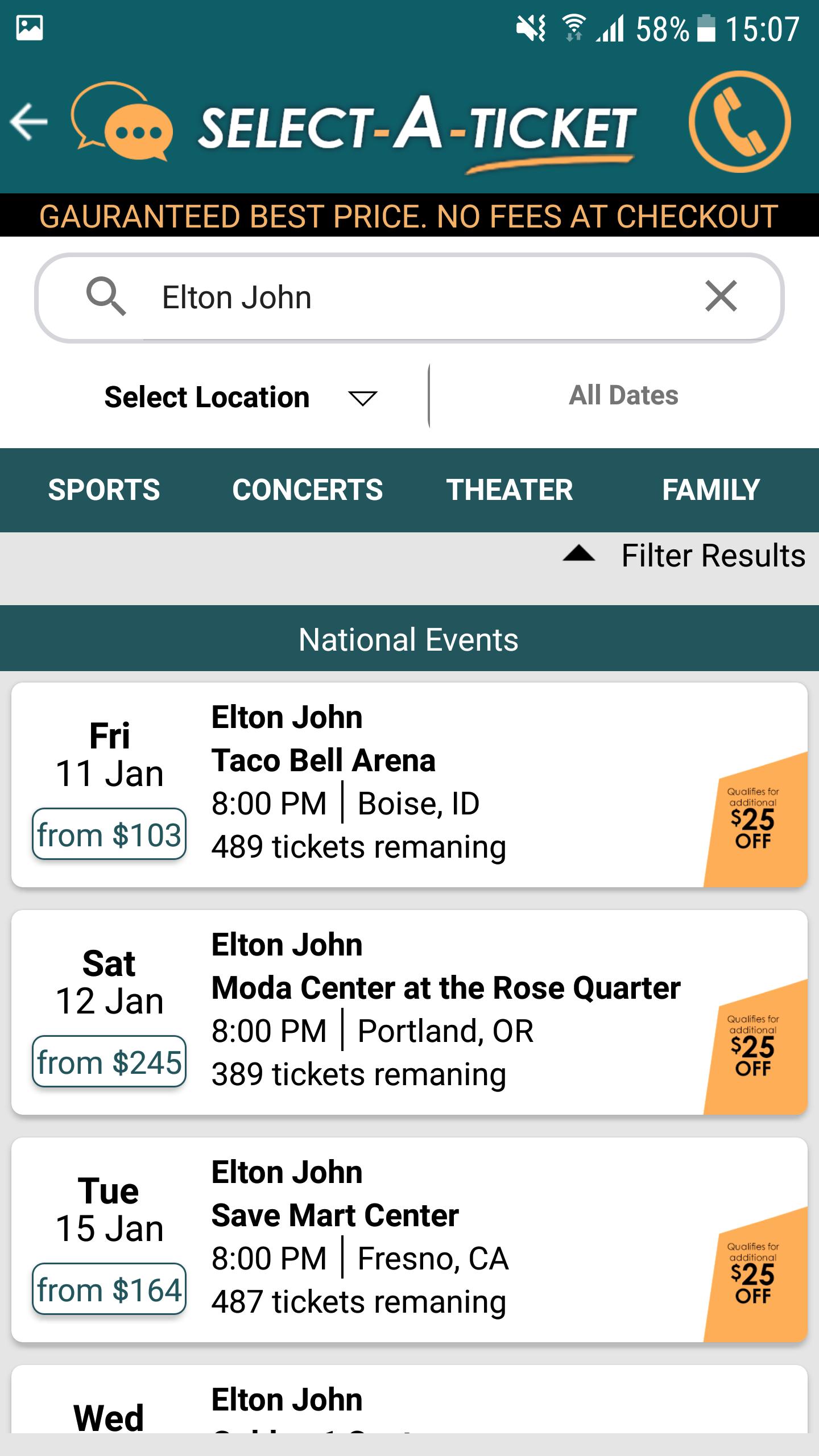 SelectAticket.com- 40年來,帶來了客戶。 “以正確價格的正確門票”與所有其他門票應用程序有所不同。這是定價的前10個列表(1)。您看到的價格是您在退房時不支付的價格。 (2)最佳價格guarentee(3)免費送貨(4)應用程序中的便捷通用工具要致電或聊天。 (5)我們的銷售團隊是個人娛樂顧問,要求他們註冊您的個人禮賓服務。 (6)應用程序中的有用工具 - 餐廳預訂,停車,天氣,指示。 (7)僅向應用程序用戶提供免費門票(8)折扣票優惠。 (9)月份的粉絲(10)個性化您的帳戶