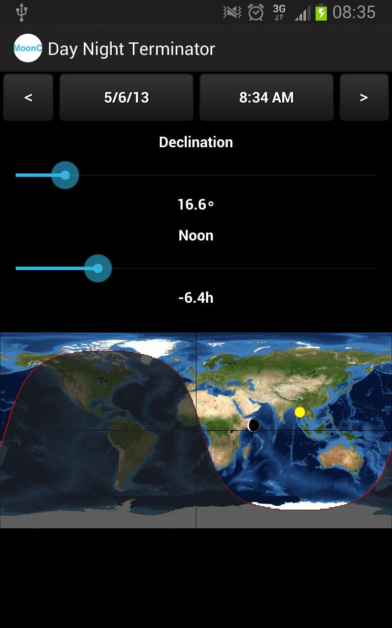 ☀看到白天的終結者根據偏斜和中午的時間在地球表面上移動。